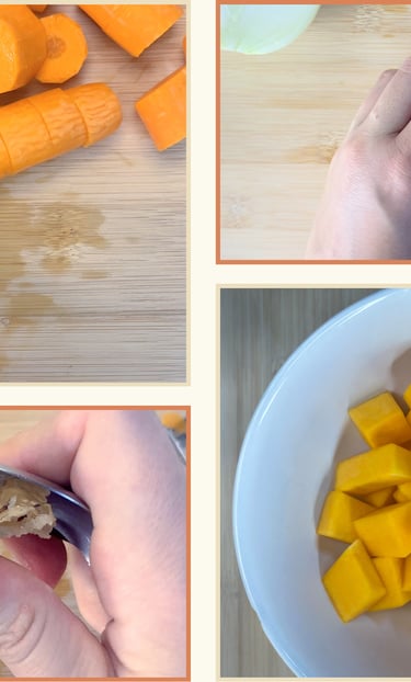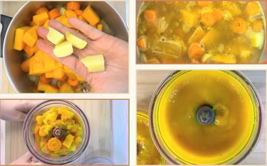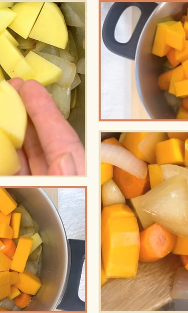 Add the pumpkin, carrots, and potato, a little more olive oil, and another pinch of salt. Cook for a few minutes to deepen the flavor.