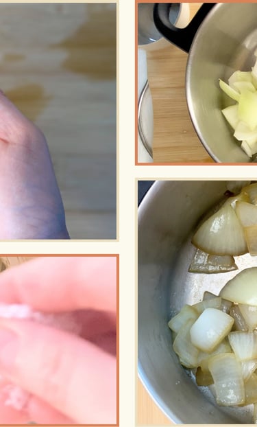 Once you’ve peeled and chopped the onion and garlic, sauté them in a pot with olive oil and a pinch of salt for about 5–10 minutes, until lightly golden and fragrant.