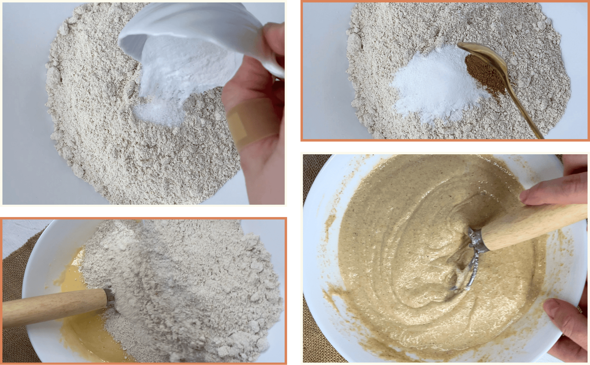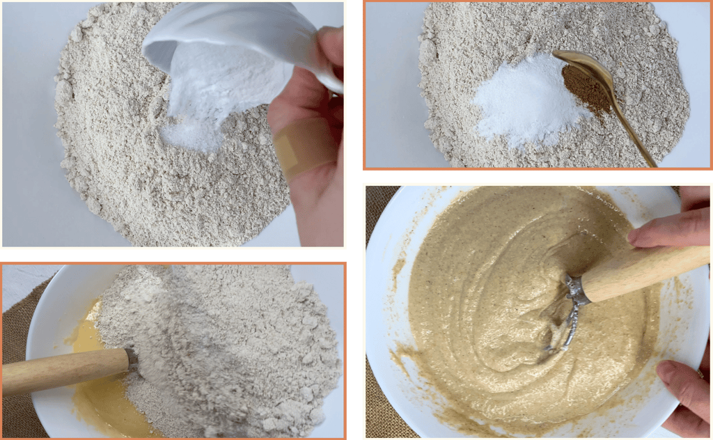 In a separate bowl mix together the oat flour, baking powder, baking soda, salt and cinnamon.