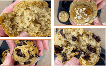 I made six plain muffins and added about sixty grams of chocolate to the remaining batter to create four chocolate muffins.
