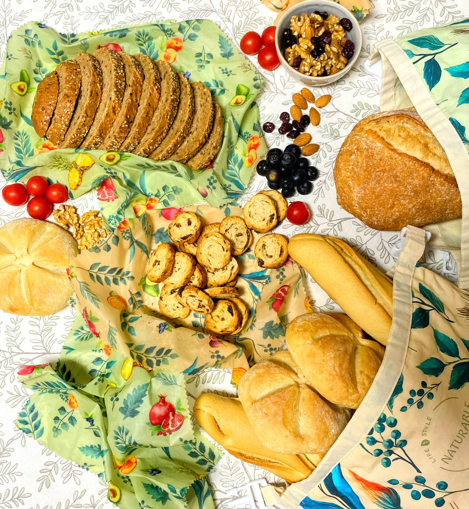 Each set includes 2 reusable bread bags and 2 wraps, made from 100% cotton, beeswax, jojoba oil, and pine resin.