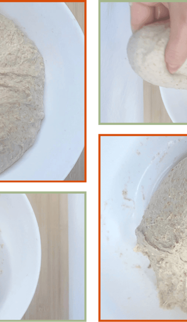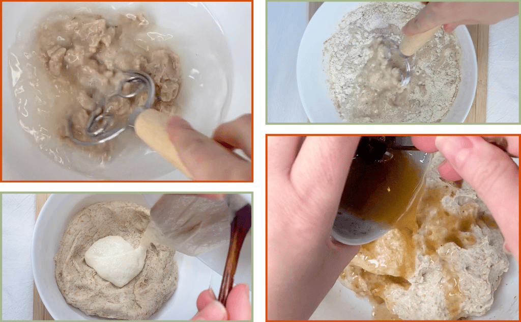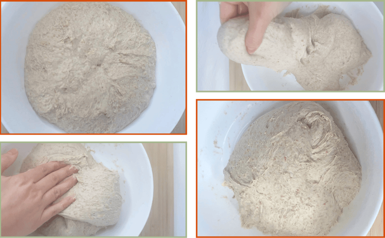 After adding the starter, honey, salt and spices, the dough may feel sticky, loose or slightly unstable, but this is expected. With folds and resting, it strengthens again.