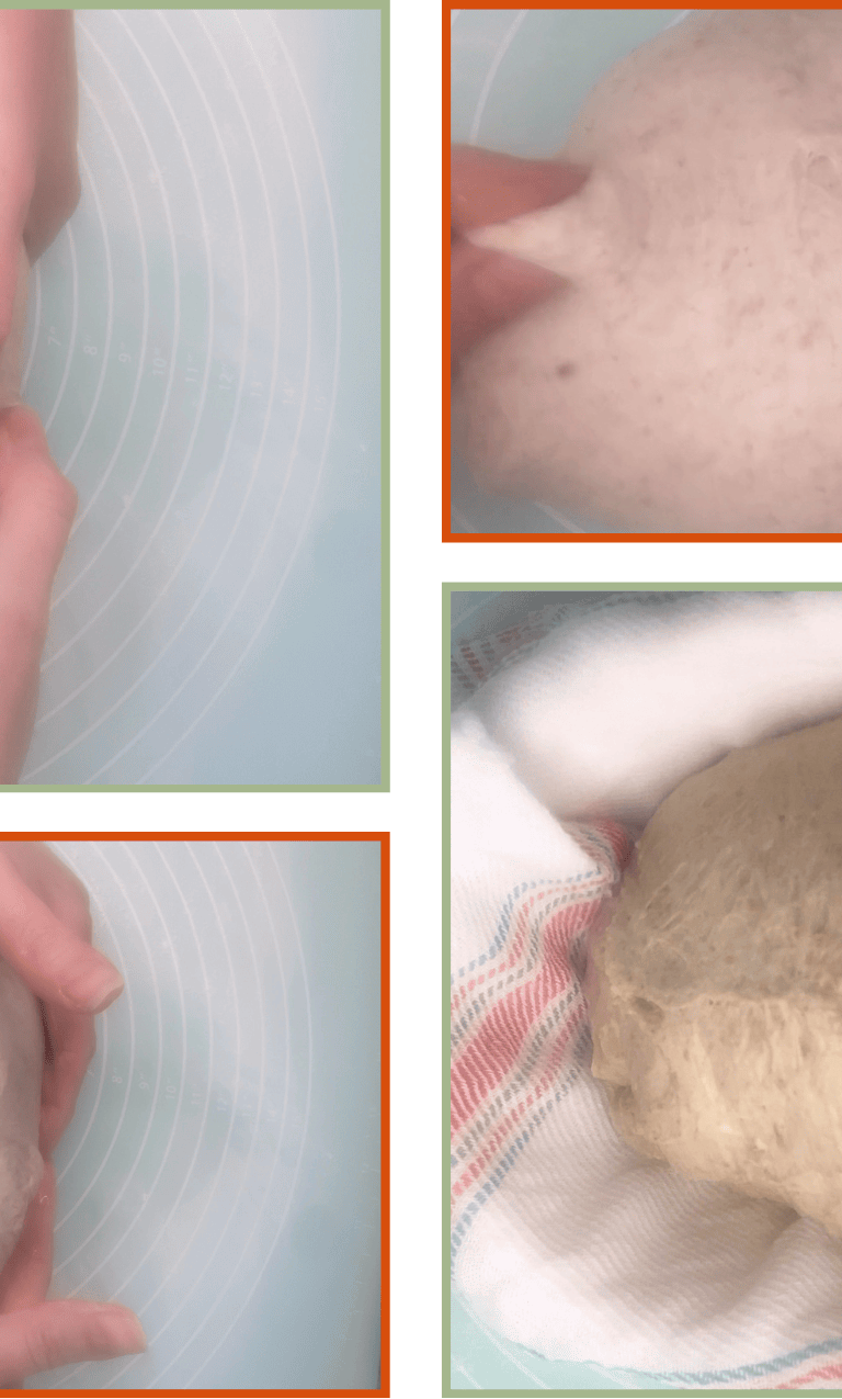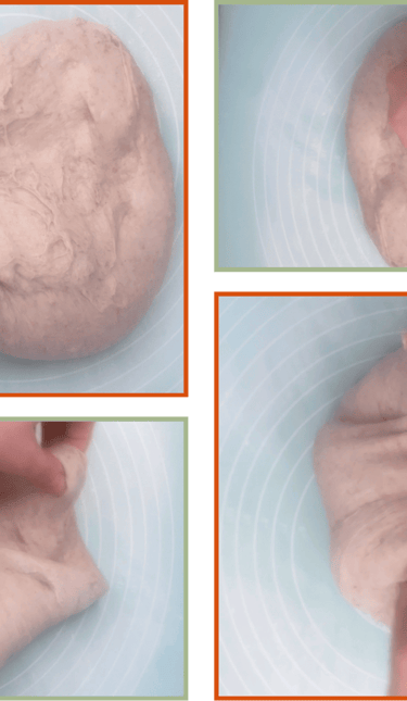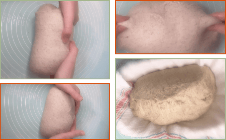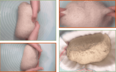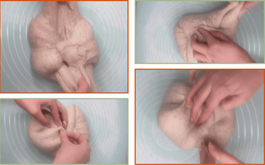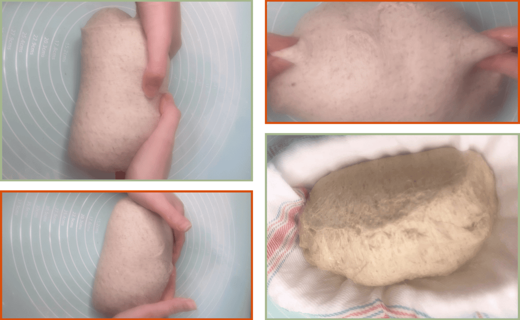 Take the dough from the bottom edge, fold it over itself, and roll it toward you while gently dragging and turning it to create surface tension.