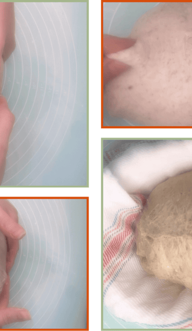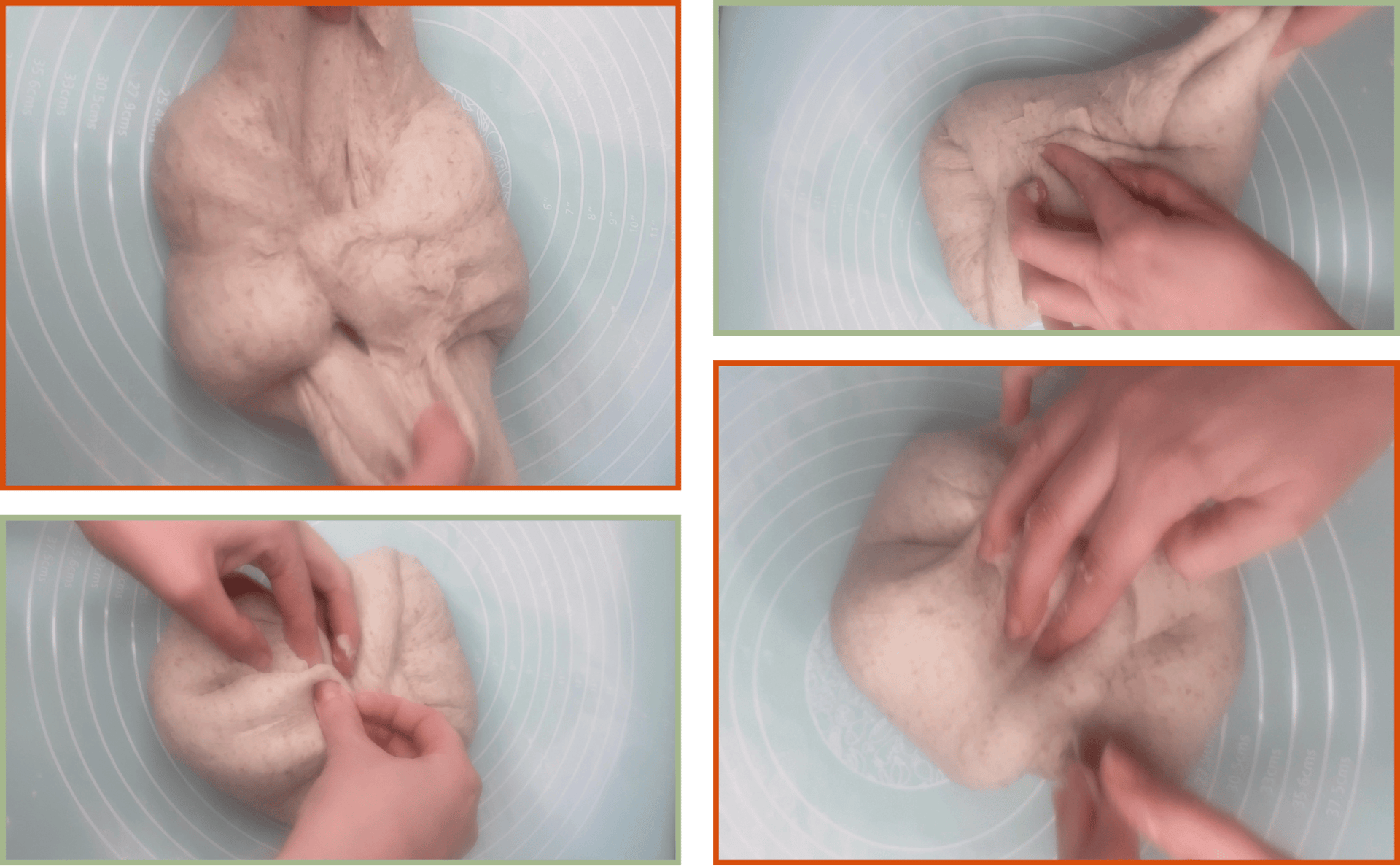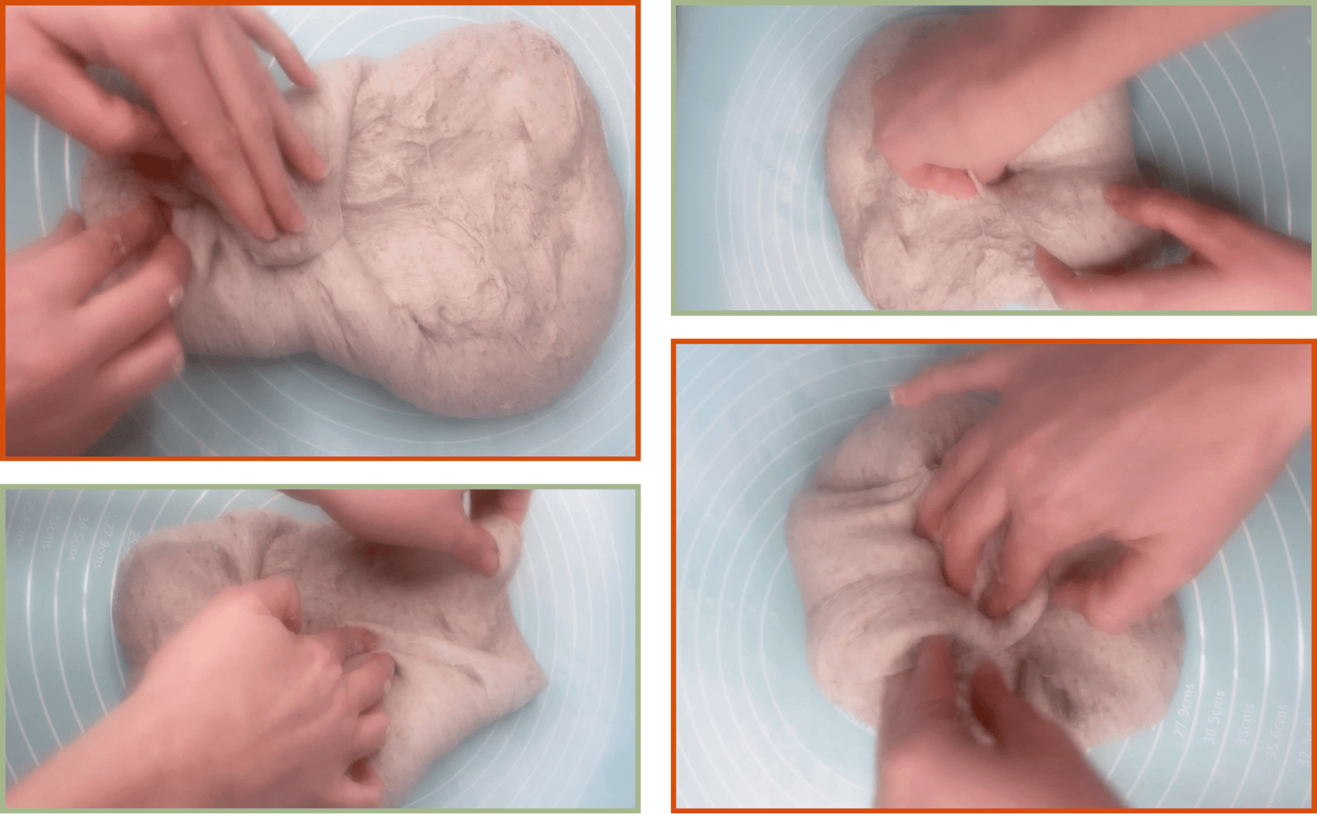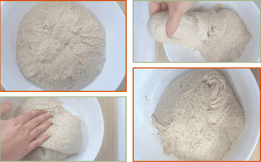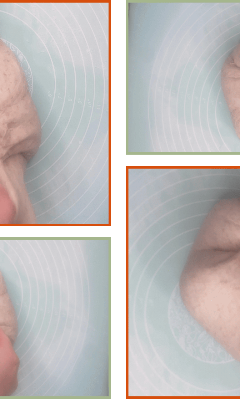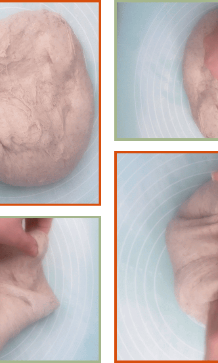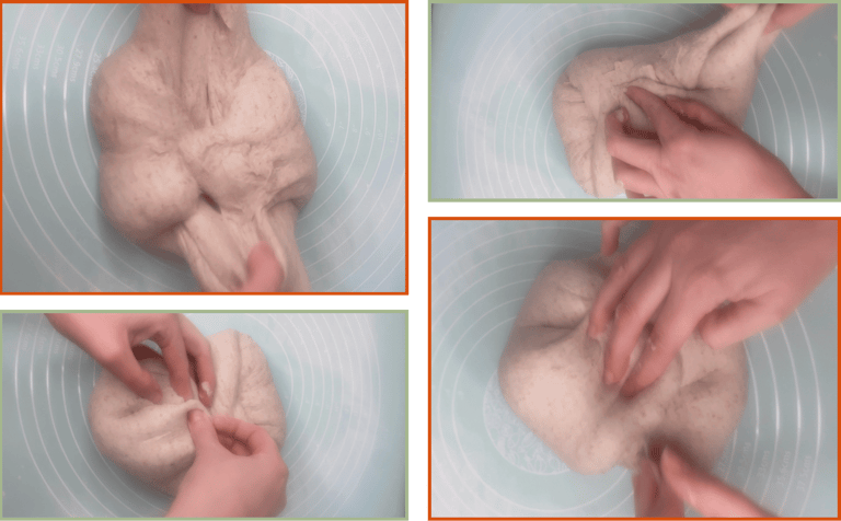 Instead of using the classic stretch-and-fold, this recipe uses a short, controlled motion: lift the very edge of the dough with your fingertips and fold it toward the center. Repeat this movement 3–4 times in each set.