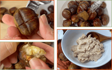 Score each chestnut with a deep X, soak them for 10 minutes, then roast at 210°C for 20–25 minutes. Peel while warm, then place them in a bowl with 20 g of hot water and 20 g of hot milk. Cover for a few minutes so they rehydrate, then blend into a thick, smooth purée.