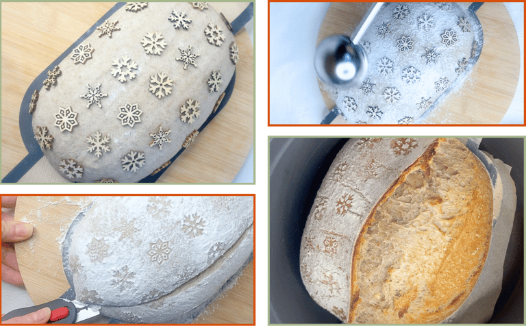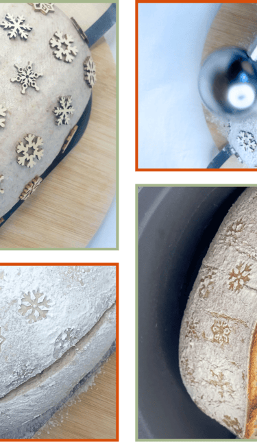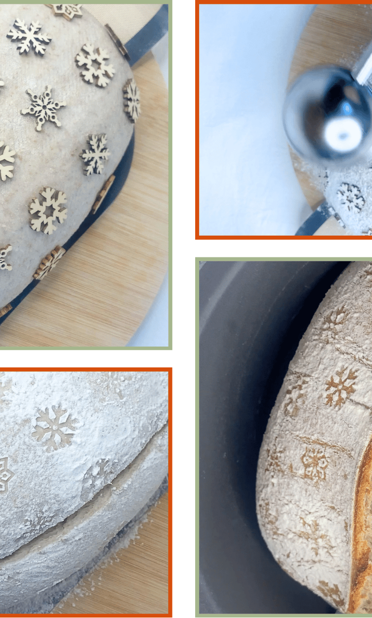 For this bread, I used small snowflake flakes that work like tiny stencils. I lightly misted the surface of the dough, placed the snowflakes on top and dusted the loaf with rice flour.