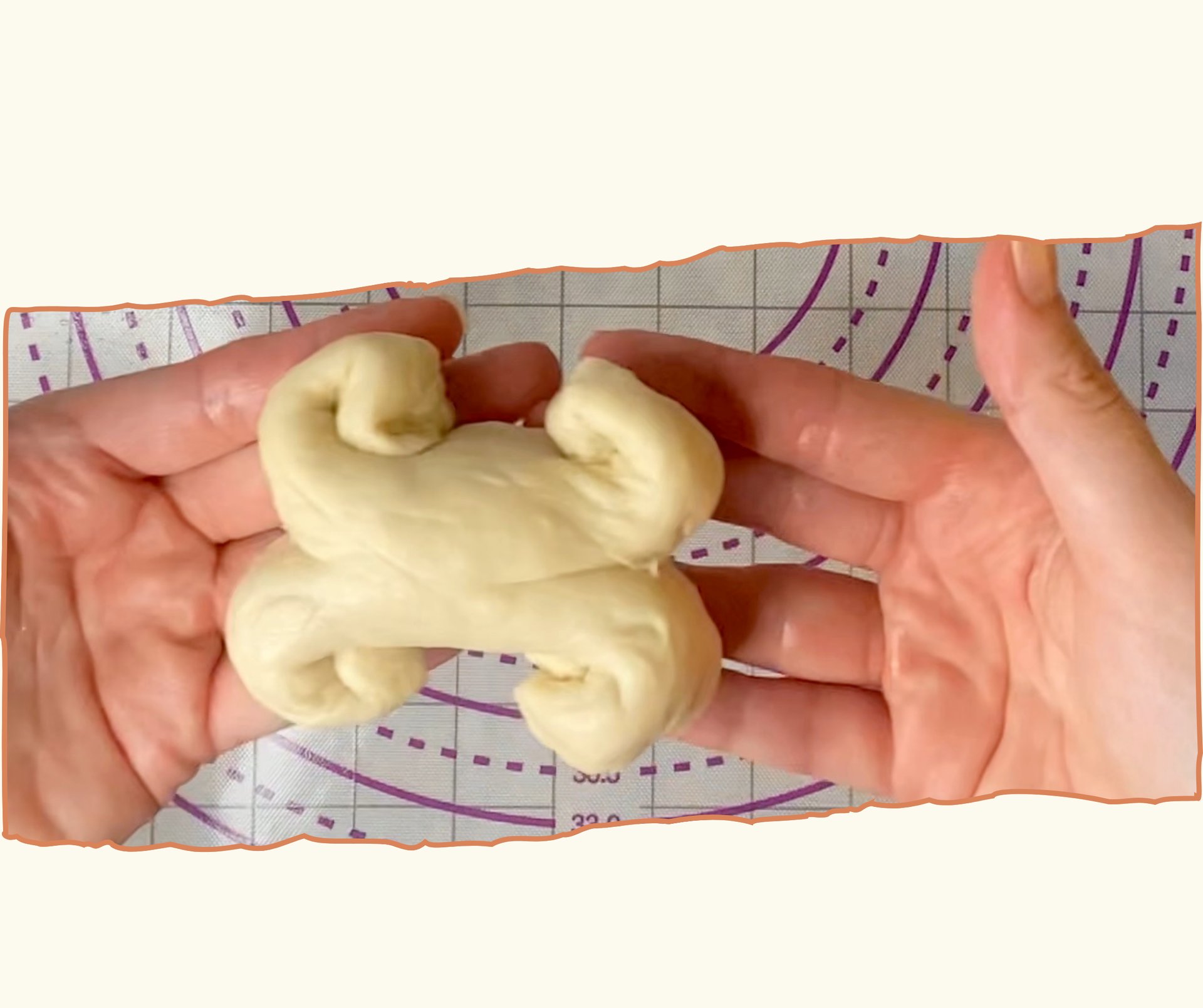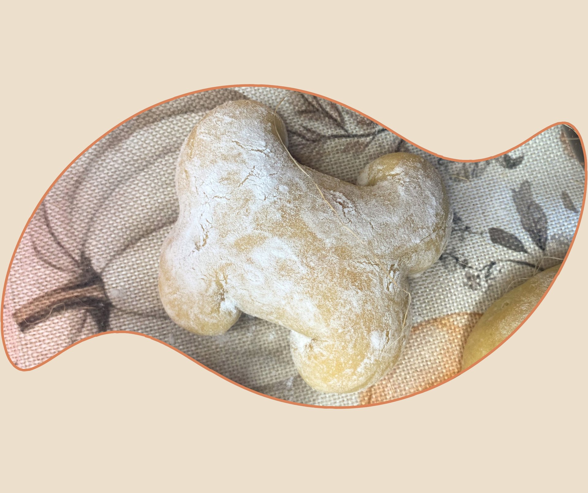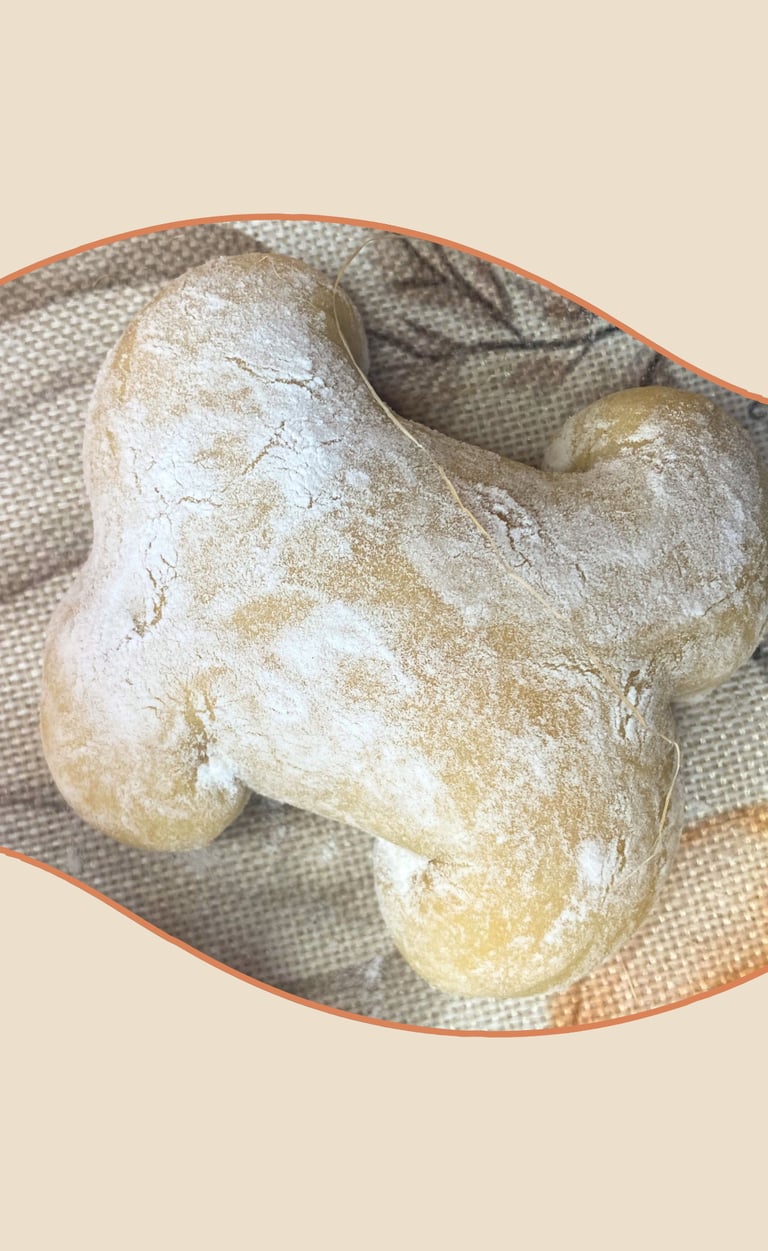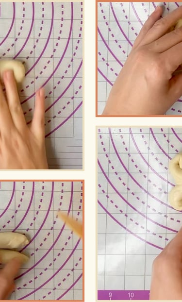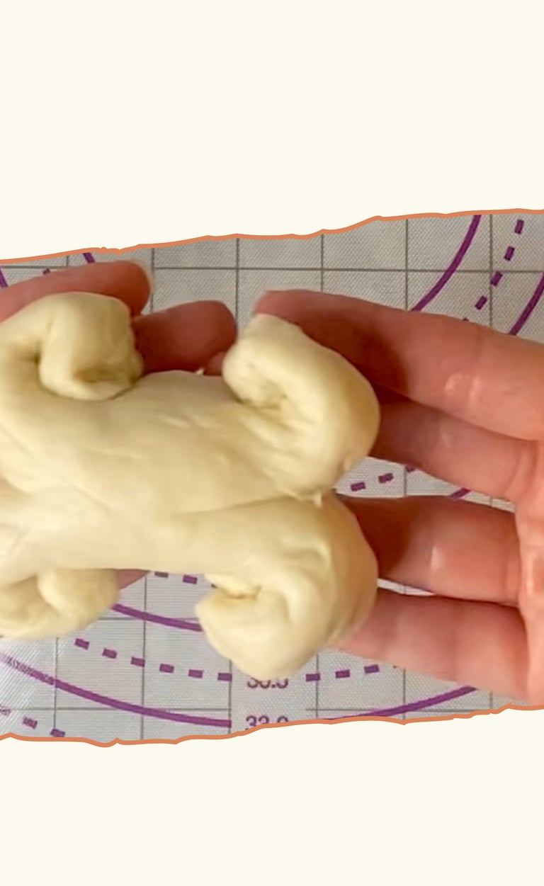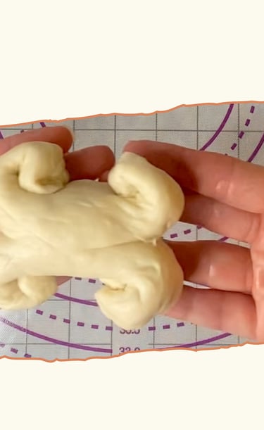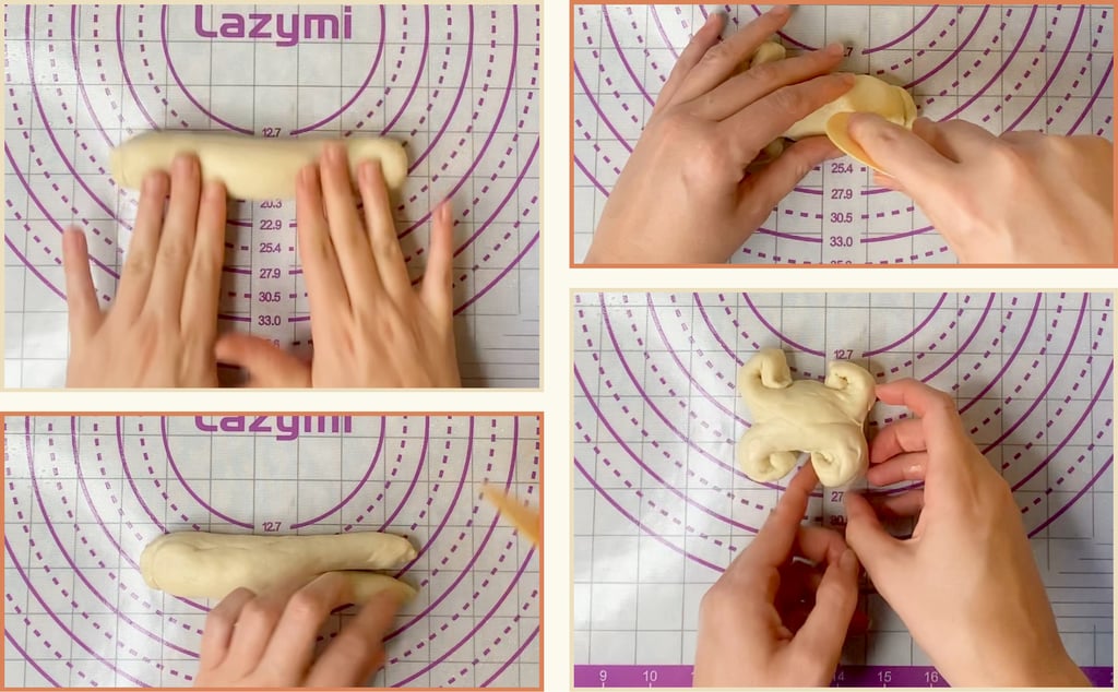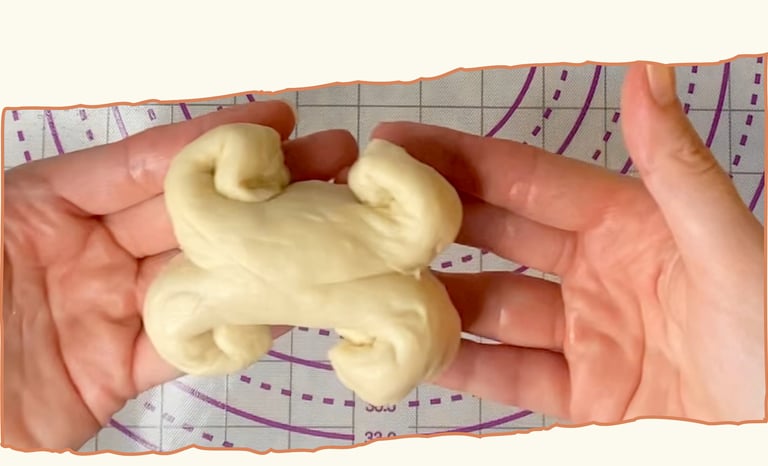 I rolled each ball into a 12–13 cm cylinder. Using a dough scraper or a pair of scissors, I made a clean cut right through the center of each tip, then gently rolled the two halves outward to form the bone “knobs.” It’s a simple move that gives a clear and playful shape.