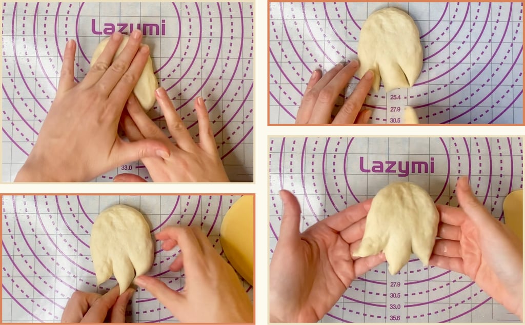 For the ghosts, I flattened a ball gently with my hand, shaping the top into a soft oval and the bottom into a slightly flatter edge. Then, using a dough scraper or scissors, I made two small cuts at the bottom and used my hands to round and stretch them slightly into a soft tail shape. You can see in the photos how the form comes together naturally once you shape it by hand.