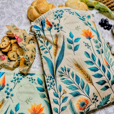 Each set includes 2 reusable bread bags and 2 wraps, made from 100% cotton, beeswax, jojoba oil, and pine resin.
