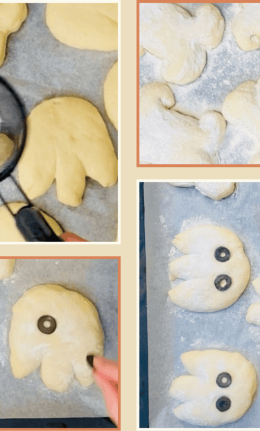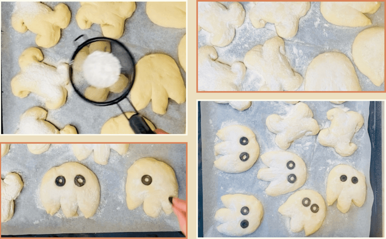 For the final finish, coat the buns and bones with a light dusting of rice flour for a pale, matte look, or brush them with beaten egg if you prefer a shiny, glazed surface. After dusting or brushing, add the eyes made from sliced black olives, pressing them gently into the dough so they stay in place while baking.