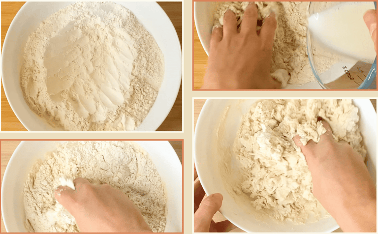 In a large bowl, mix the flour and salt, then add the milk with the yeast, followed by the honey and oil. Mix until everything starts to come together into a soft dough. It should feel slightly tacky but not sticky. If the dough feels too dry, add a tablespoon or two of extra milk until it feels smooth and elastic.