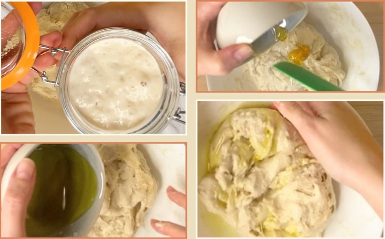 Once the starter was mixed in, I added the honey and worked it through. When the honey was about halfway integrated, I added the salt, and only then the oil. This order matters: honey first, then salt, and oil at the end so it doesn’t interfere with gluten development. The dough feels firm at first, which is normal for an enriched dough. I kneaded for about ten minutes by hand, taking short two-to-three-minute rests whenever it tightened up. Those pauses let the gluten relax and make the dough easier to finish. In a stand mixer, six to seven minutes on low to medium speed should be enough.