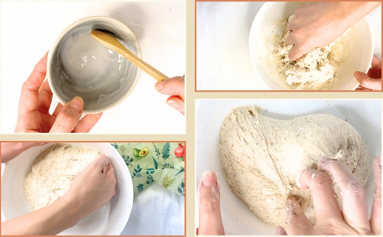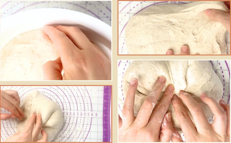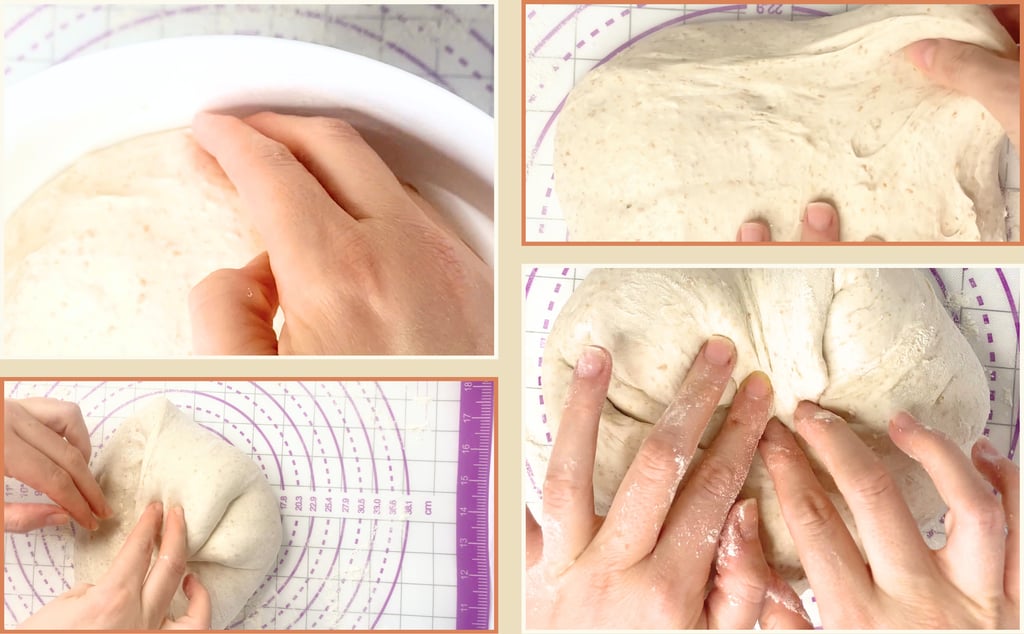 Stretch and fold the dough onto itself gently in the bowl for 8–10 minutes. You can also push the dough away from you with the heel of your hand, fold it over, rotate, and repeat. Keep your hands damp to prevent sticking.