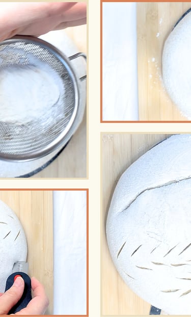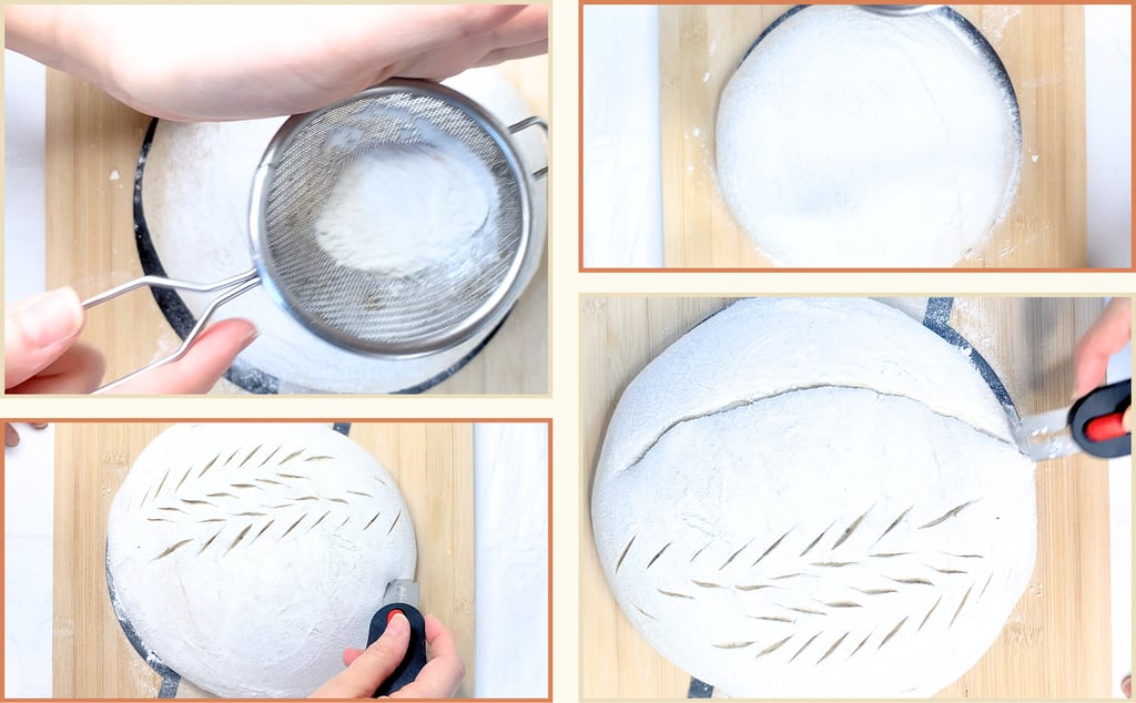 For a rustic, flour-dusted finish, use rice flour before scoring, it resists moisture and makes patterns stand out better.