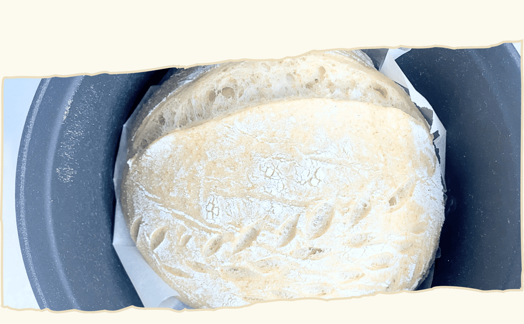 For extra steam inside a Dutch oven, you can also place 2–3 small ice cubes under the parchment right before closing the lid, but this is not totally necessary.
