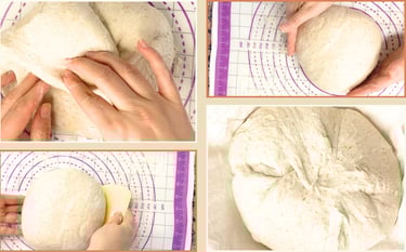 Then flip it seam-side down and use your hands to gently tighten it into a taut ball by rotating it on the counter and pulling it slightly toward you with each turn.
