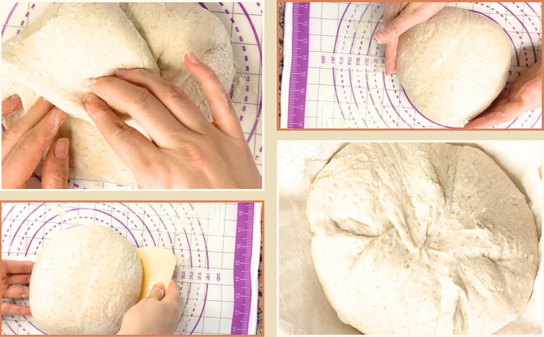 Begin forming a loose round by lifting one edge of the dough and folding it toward the center; continue around the dough, folding each edge inward like wrapping a package.
