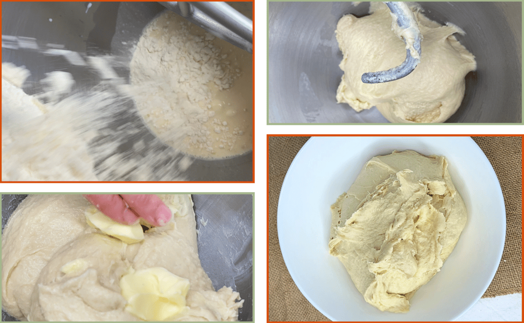 Add the softened butter in three additions. Drop one third of the butter into the bowl and let the hook work until it disappears into the dough. Repeat with the second and third portions. The dough will look a little messy for a moment, then become smooth and shiny as the butter is absorbed.
