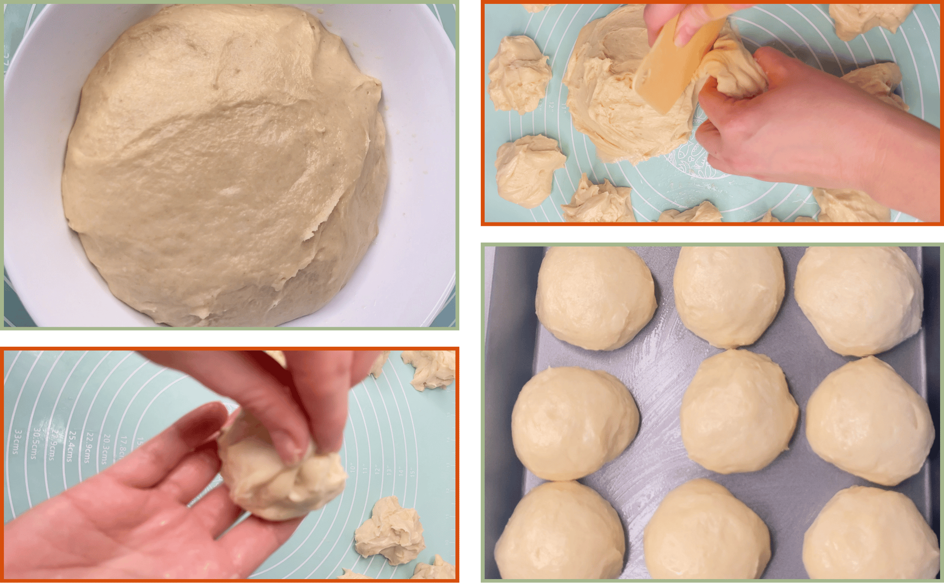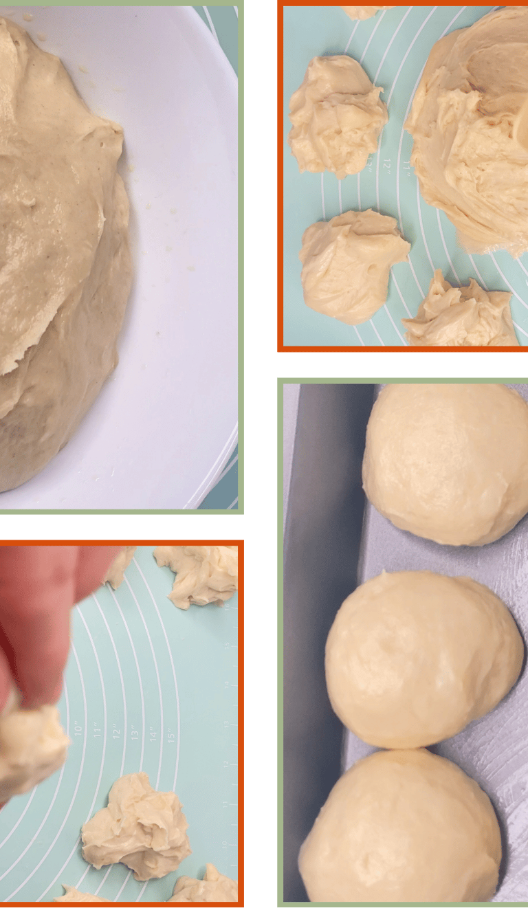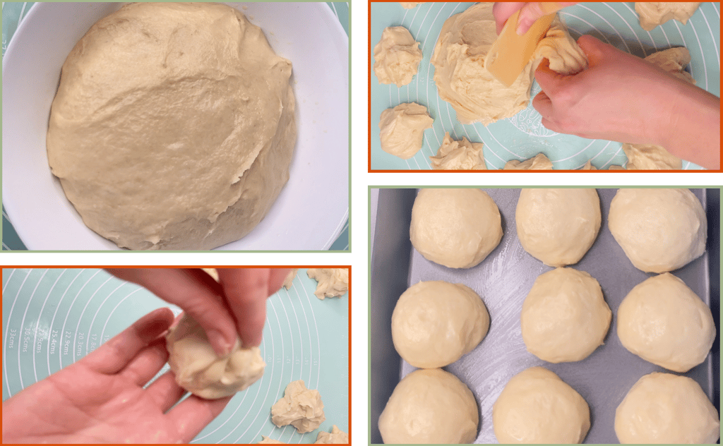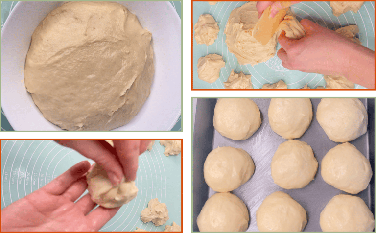 To shape each roll, flatten the piece slightly, then tuck the edges toward the centre and pinch them together underneath. Turn the ball seam side down and roll it gently against the counter to create a smooth round top.