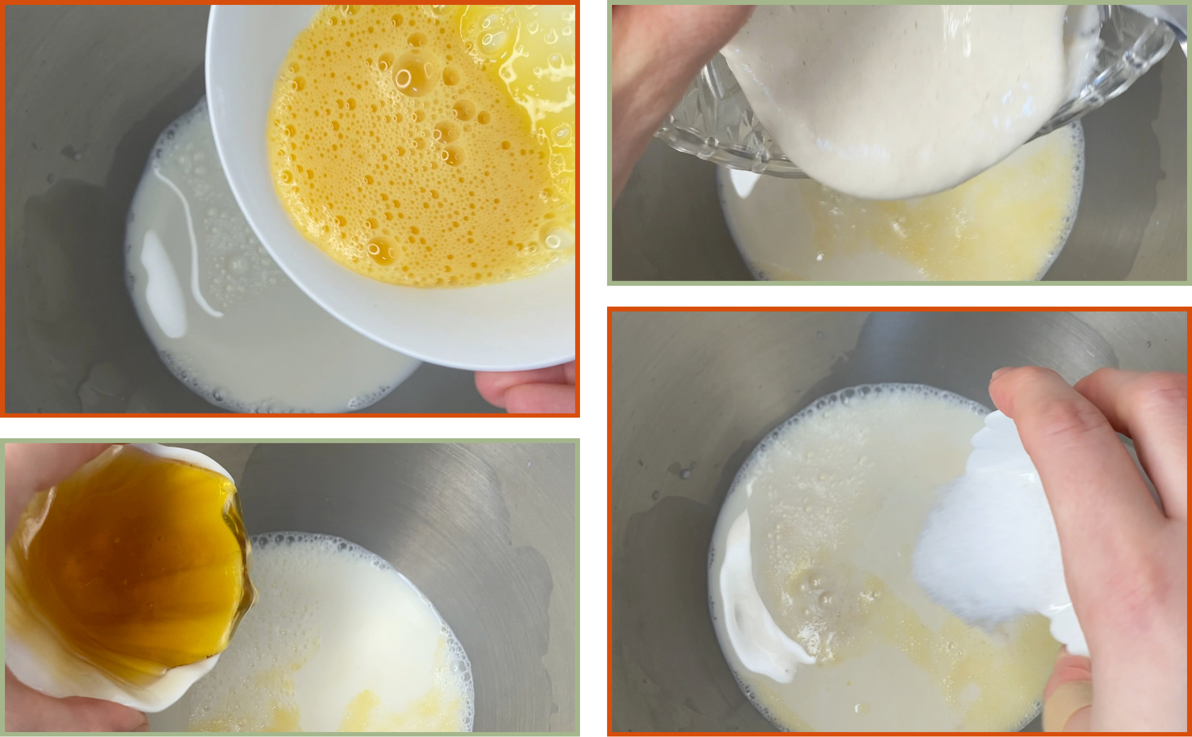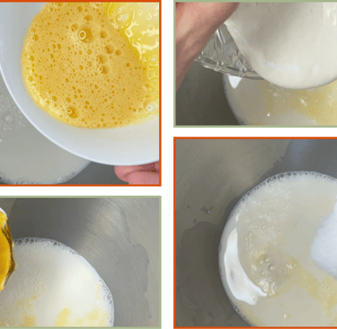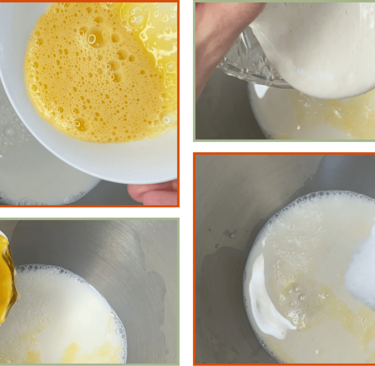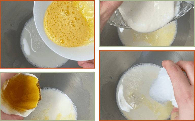 Add the warm milk, honey, egg and active sourdough starter to a large bowl. Whisk or stir until the mixture looks smooth and even.