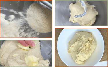 Add the softened butter in three small portions. For each portion, place the butter on top of the dough, press it in with your fingers and fold the dough over it. At first it will look greasy and broken, but keep folding, pressing and gathering the dough. The butter will slowly disappear and the dough will become smooth again.