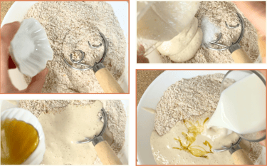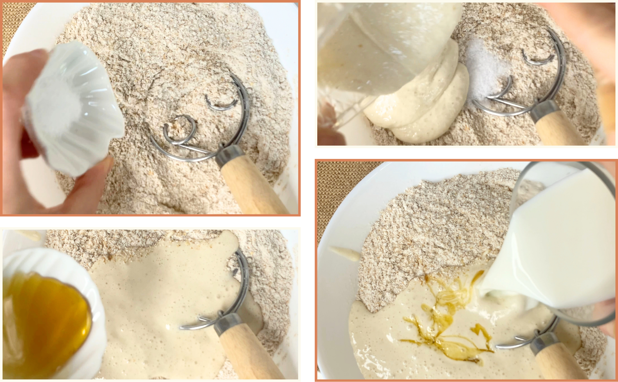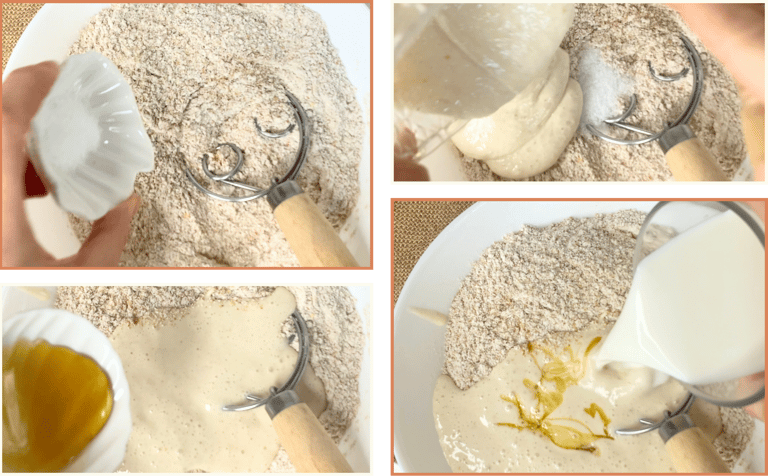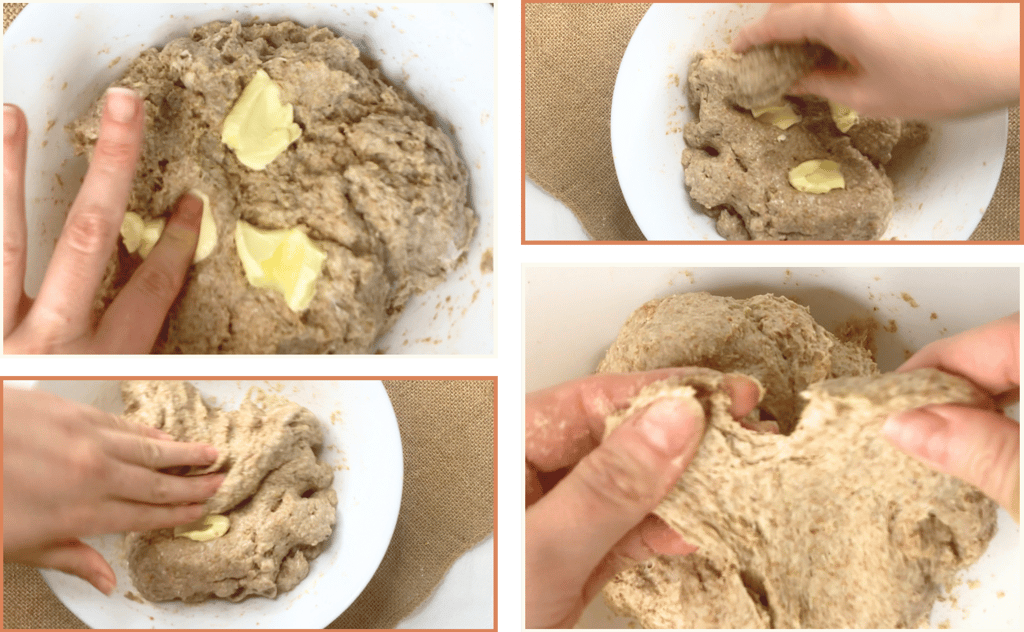 Note: At this stage, it’s important to adjust expectations. This dough is not meant to develop strong or highly elastic gluten. Gluten development in this loaf depends heavily on the flours used. Whole wheat flour naturally develops less elastic gluten than white flour, and when it’s combined with other flours that are not wheat, such as rye or spelt, the gluten structure becomes even weaker. In addition, the presence of milk, butter, and sugar further softens the dough and limits elasticity.