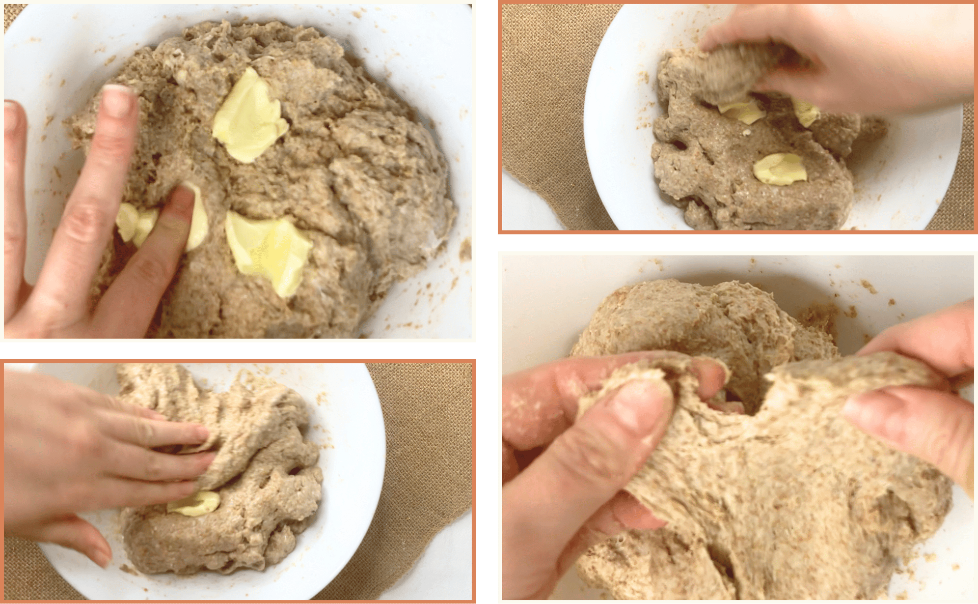 Once the dough is cohesive, add the softened butter. Work it into the dough until it is fully absorbed and the dough no longer feels greasy. Continue kneading gently, just enough to bring everything together and give the dough some initial strength. Knead for about five to eight minutes, until the dough feels smoother than it did right after mixing.