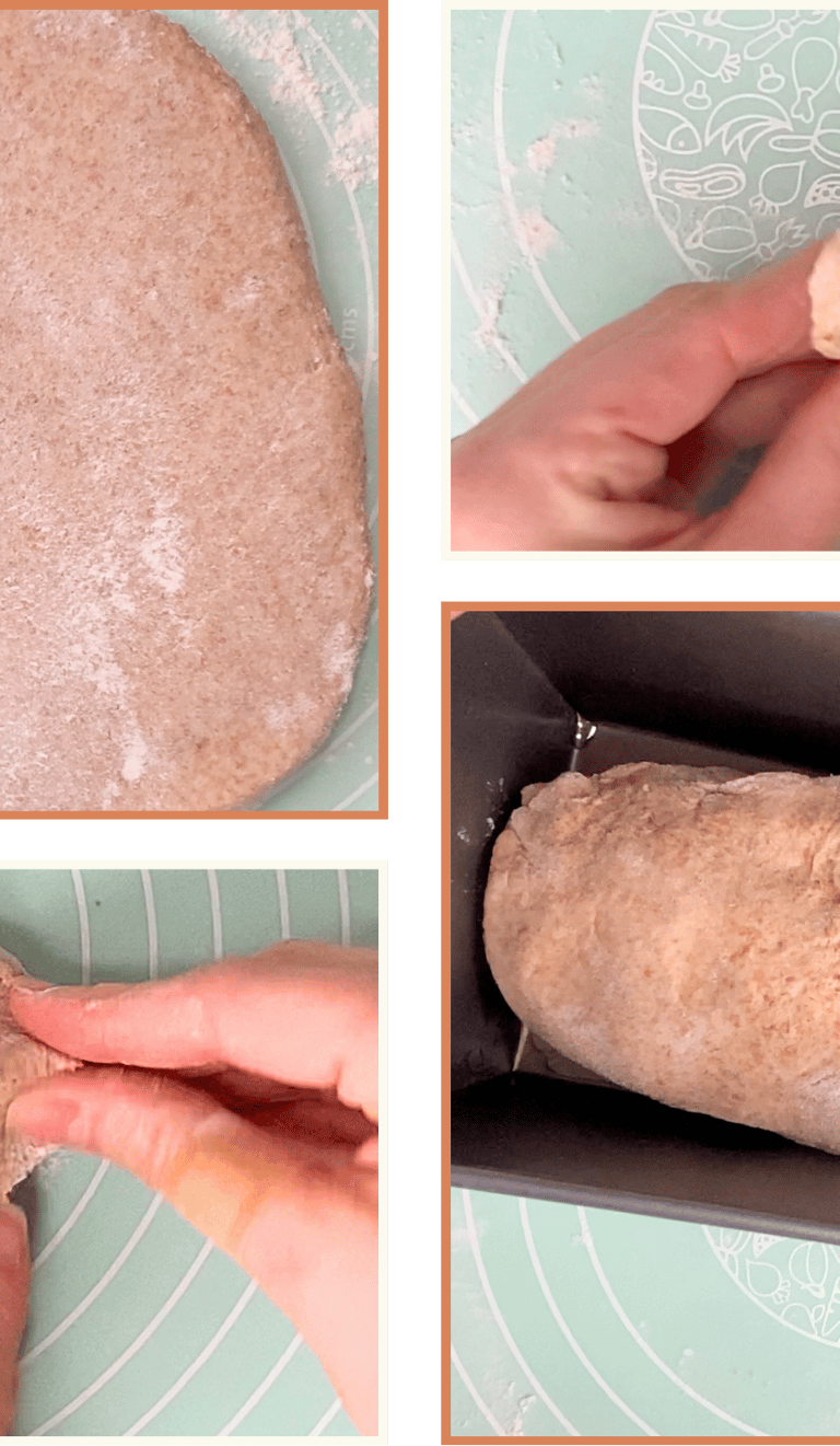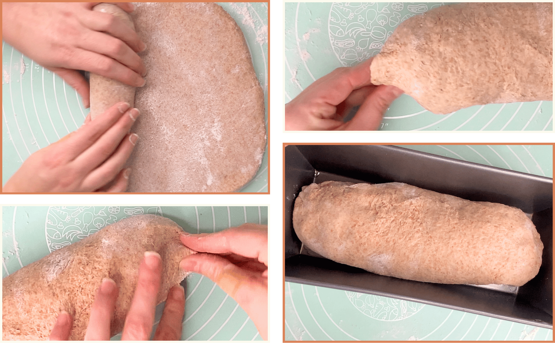 After the last fold and rest, shape the dough using a rolling pin. Gently roll the dough into a rectangle, keeping the thickness as even as possible. Roll it up tightly into a log, seal the seam, and tuck the ends so the loaf fits neatly into the pan. Adjust the length of the log so it matches the loaf pan. This shaping method helps create a tighter crumb and cleaner slices, which are ideal for a sandwich-style loaf.